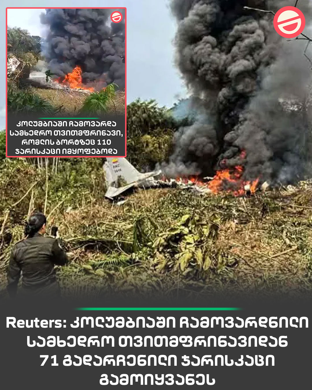 კოლუმბიის სამხრეთში, პერუს საზღვართან ახლოს ჩამოვარდნილი სამხედრო თვითმფრინავიდან 71 გადარჩენილი ჯარისკაცი გამოიყვანეს | ინფორმაციას Reuters წყაროებზე დაყრდნობით ავრცელებს და წერს, რომ შესაძლოა, გადარჩენილი ადამიანების რიცხვი გაიზარდოს. ამ დროისთვის დაღუპულთა ზუსტი რაოდენობა და ავიაკატასტროფის მიზეზი უცნობია
