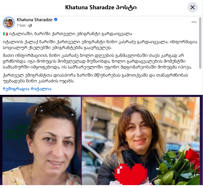 იტალიის ქალაქ ბარიში ქართველი ემიგრანტი ნინო კასრაძე გარდაიცვალა. ინფორმაცია სოციალურ ქსელებში ემიგრანტებმა გაავრცელეს.